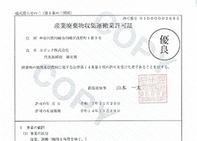 | 産業廃棄物収集運搬業 | 神奈川県 第01403002665号 東京都 第13-00-002665号 千葉県 第01200002665号 埼玉県 第01102002665号 茨城県 第00801002665号 群馬県 第01000002665号 栃木県 第00900002665号 山梨県 第01900002665号 静岡県 第02201002665号 |